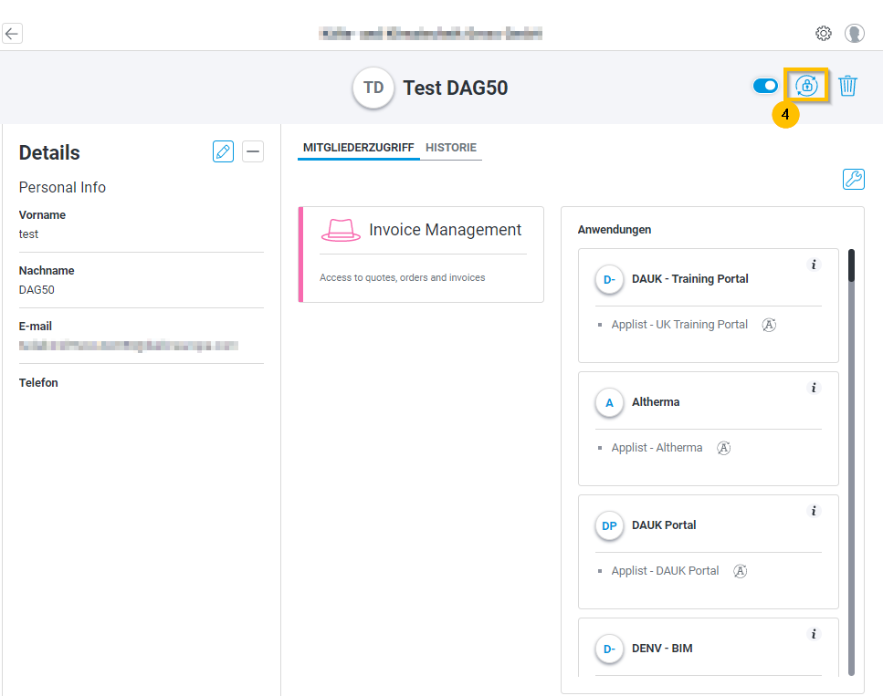 4. Klicken Sie auf das jeweilige Icon, um entweder den Nutzer zeitweise zu deaktivieren (Aktivierung zu einem späteren Zeitpunkt wieder möglich) oder unwiderruflich aus dem Kundenportal zu löschen.