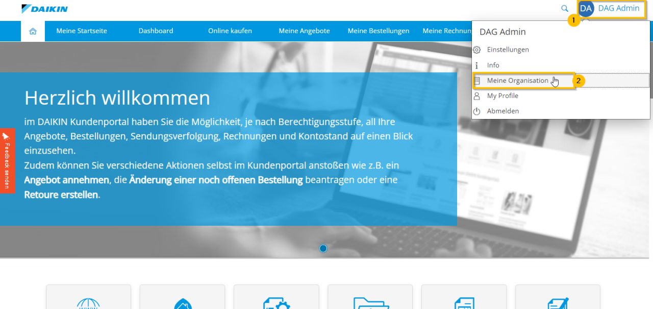 Ein Grund, warum Sie einzelne Menüpunkte im Kundenportal (z.B. Angebote, Bestellungen, Rechnungen, Kontostand) nicht sehen können ist, dass Ihnen dafür keine Berechtigungen zugeteilt wurden. Je nach der hinterlegten Berechtigungsstufe, können Sie dies entweder selbst für sich anpassen (Berechtigungsstufe = „Delegated Admin“) oder wenden sich an den entsprechenden „Delegated Admin“ innerhalb Ihrer Firma. Auch ihr zuständiges Daikin Regionalbüro kann Sie hierbei unterstützen und Ihnen die entsprechenden Rechte, sofern von Ihrer Firma vorgesehen, zuteilen.
