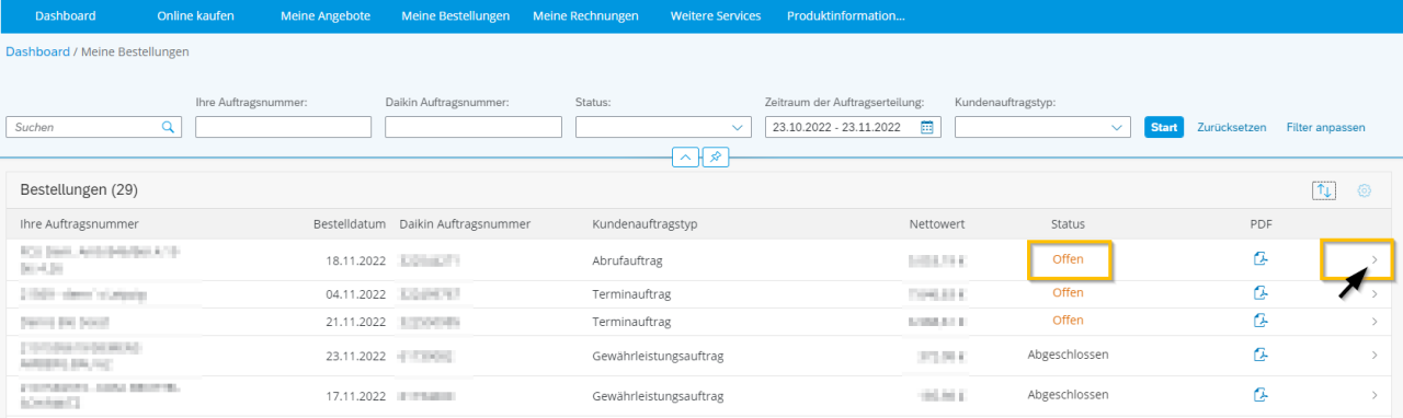 - Wenn Sie nach einer bestimmten Bestellung suchen, können Sie entweder das Suchfeld nutzen oder den Filter entsprechend einstellen, damit nur bestimmte Bestellungen angezeigt werden (z.B. Zeitraum der Auftragserteilung, Status usw.).