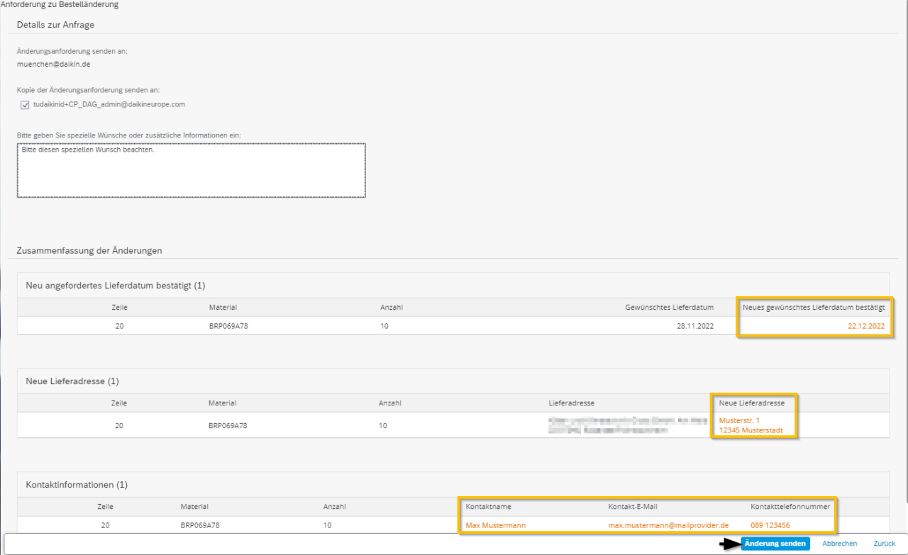 - Bestellung ändern (Abrufdatum, Lieferadresse, Ansprechpartner vor Ort)