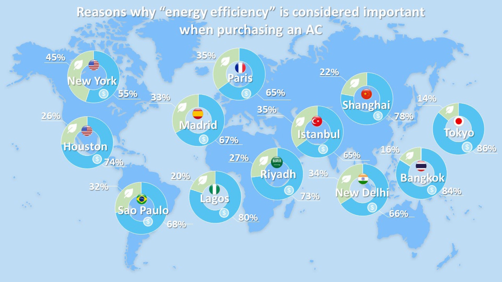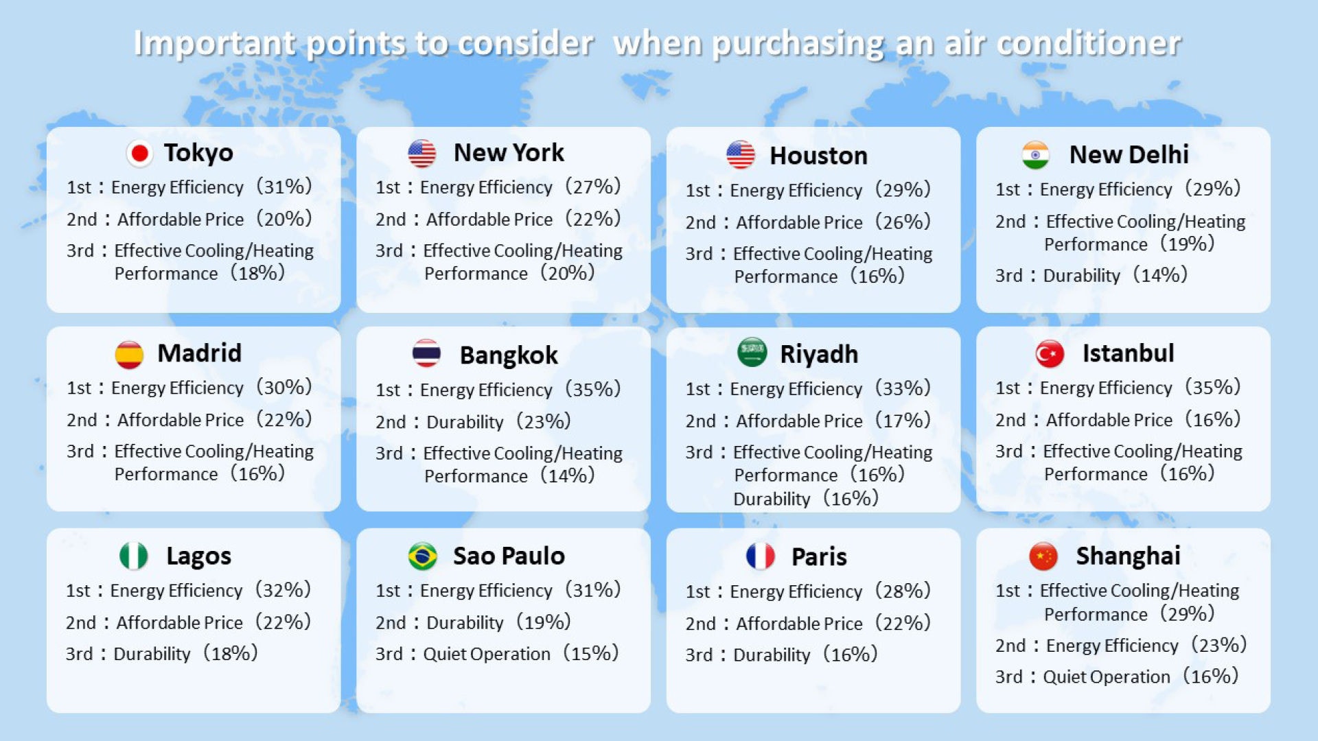 - Energy efficiency is the primary choice criterion when purchasing an AC in 11 out of 12 cities. A relatively high proportion of respondents in New York, Istanbul, Paris and Madrid cited ‘a desire to reduce environmental impact’ as a key reason for prioritizing ‘energy efficiency’.
