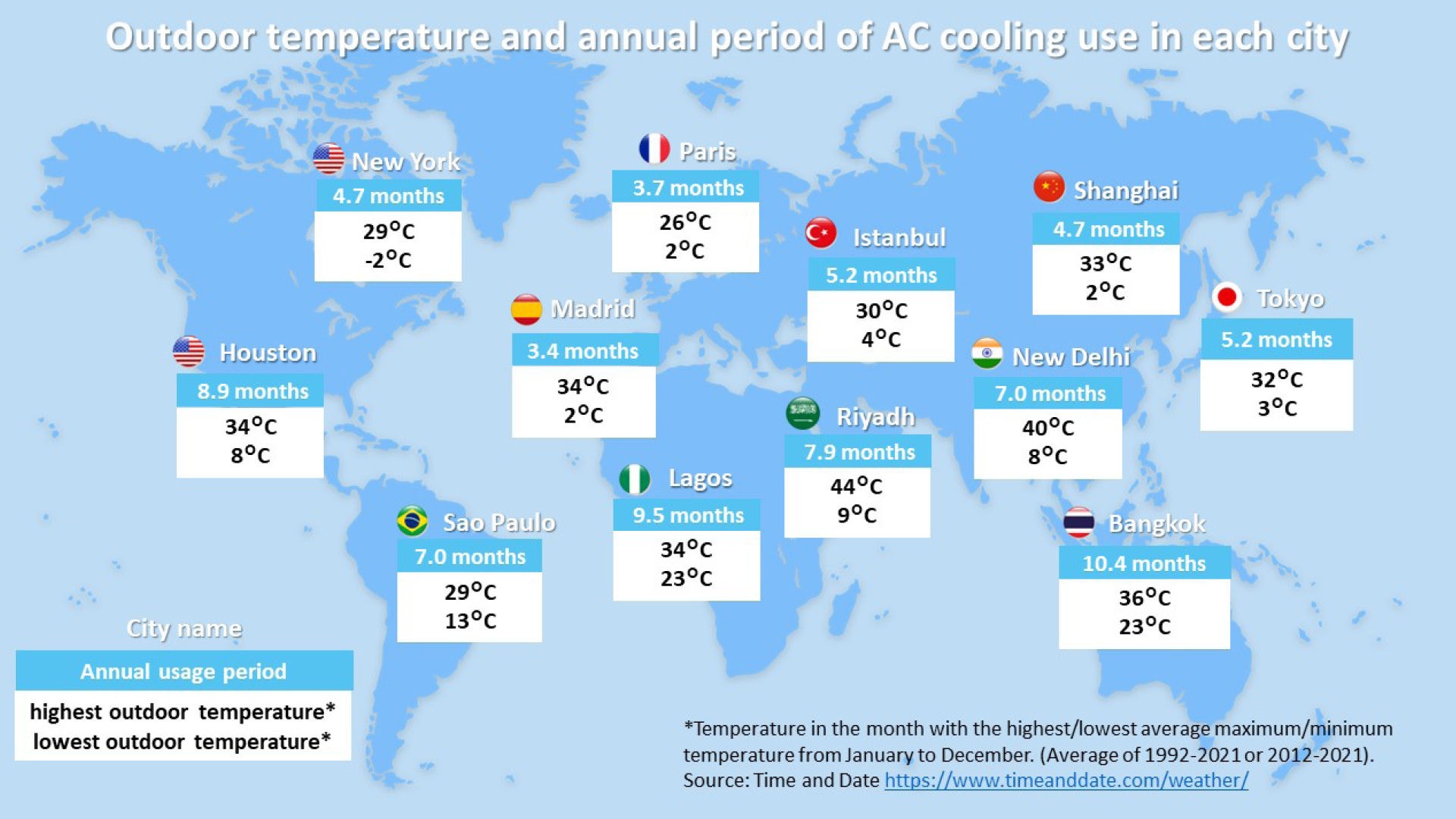 On the other hand, the shortest period of use was 3.4 months in Madrid, followed by 3.7 months in Paris. In Europe, AC cooling seems to be used only in the summer in many cases.