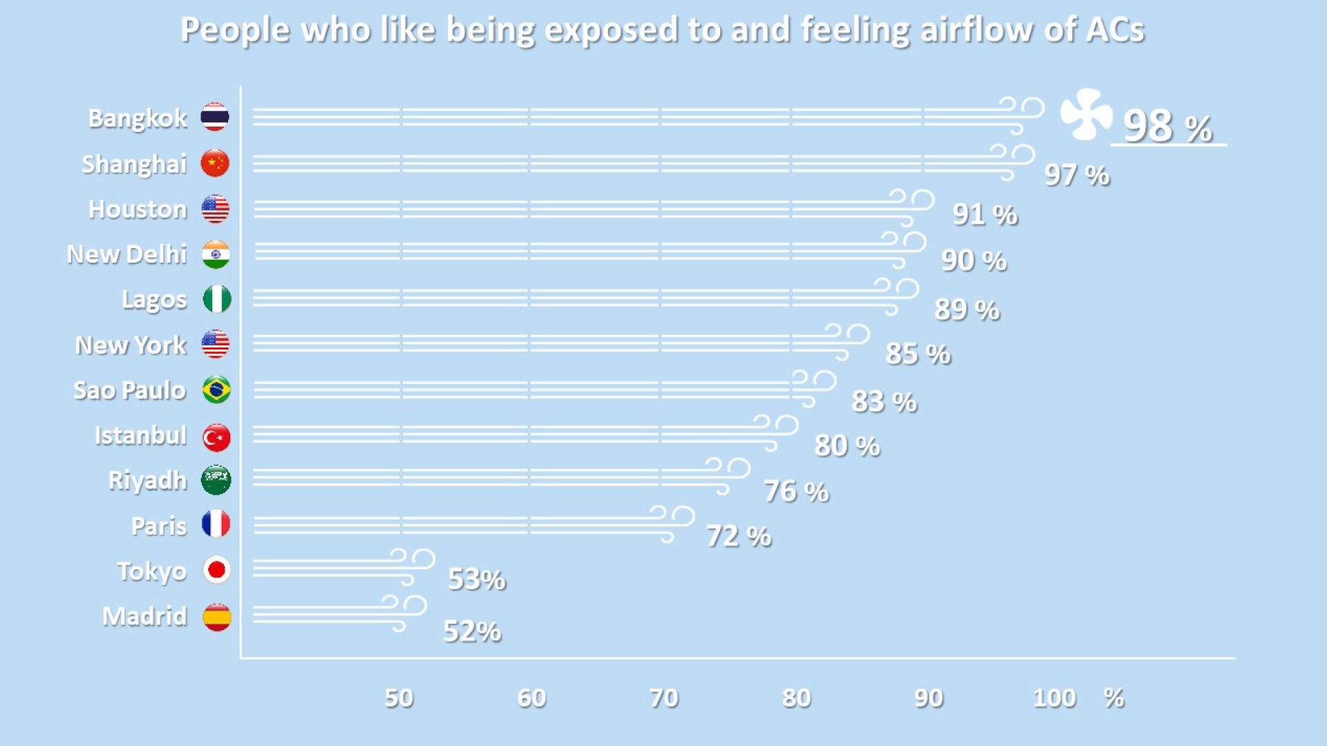- Madrid recorded the lowest percentage of people who like being exposed to and feeling the airflow of AC during the hottest months, at 52% among the 12 cities surveyed.
