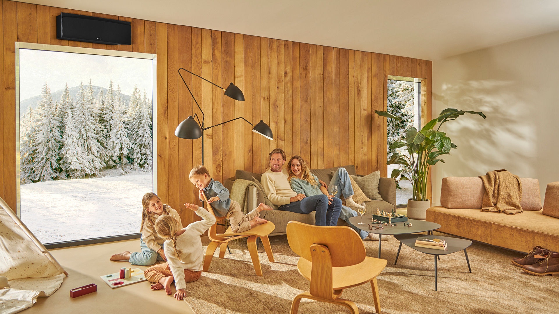 Once the room reaches the set temperature, the fireplace logic function automatically starts, switching off the indoor unit heating while maintaining the fan rotation to evenly distribute warm air throughout the room.