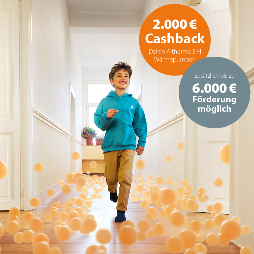 Erhalte jetzt für kurze Zeit 2.000 EUR Cashback beim Kauf eines Daikin Altherma-Wärmepumpensets der Baureihen Daikin Altherma 3 H MT oder H HT. Gilt bei Kauf im Daikin Flagship-Store oder bei teilnehmenden Fachpartnern. Das Angebot gilt vom 2. Februar bis zum 31. März 2026.