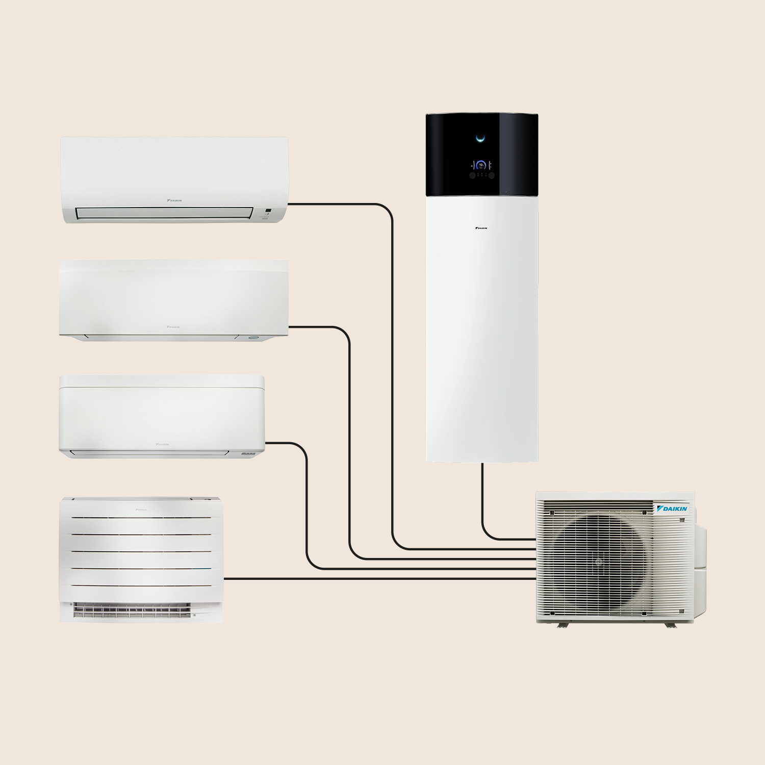 Heize und kühle dein Zuhause, und bereite Warmwasser, indem du an das Außengerät bis zu vier Innengeräte und einen Warmwasserspeicher anschließt.