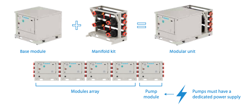 Vereinfachte Installation mit dem Verteiler-Bausatz mit allen Rohrleitungen zum Verbinden der Module an der Wasserseite. Um die Installation vor Ort noch schneller abzuwickeln, kann der Verteiler-Bausatz auch bereits werksseitig vormontiert werden. Außerdem kann die Reihe der Module um ein spezielles Pumpenmodul ergänzt werden. Diese Ausführung ist mit Inverter-Pumpen ausgestattet und verfügt über ein Ausdehnungsgefäß mit einem Volumen von 18 Litern. Um die Installation noch unkomplizierter zu gestalten, kann eine Option „Einzelne Spannungsversorgung“ integriert werden. Dadurch wird erreicht, das zu einer aus bis zu 4 Modulen bestehenden Einheit nur 1 Spannungsversorgungskabel verlegt werden muss (Kabel zum Verbinden der Module werden werksseitig geliefert).