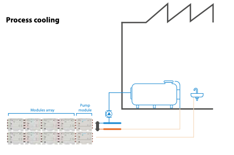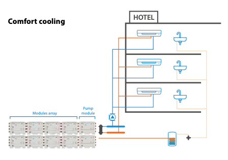 Zentrale Kühlung. Unabhängige Warmwasserbereitung (Einzelgerät oder ggf. übereinander angeordnete Geräteeinheit, die ausschließlich für die Warmwasserbereitung genutzt wird). Geräte können in Master/Slave mit bis zu 4 Modulen je Master betrieben werden